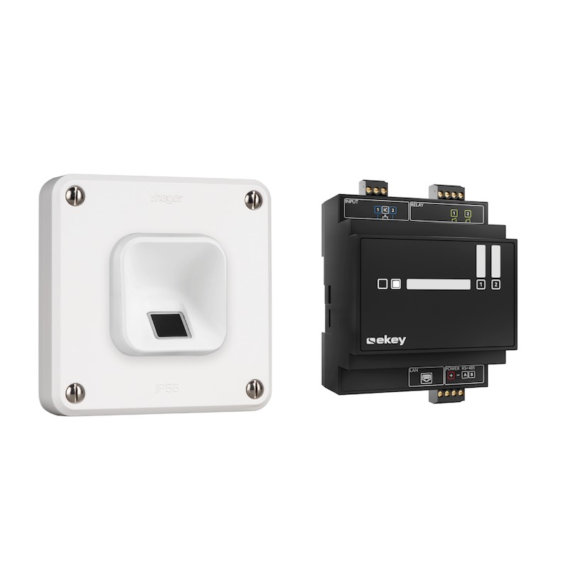 The ekey xLine fingerprint scanner set is a biometric access solution that uses intuitive touch operation to provide keyless access to buildings. It also gives front doors and side doors or garages smart functions, so that intelligent use of a building begins in the entrance area. The set includes the xLine universal fingerprint scanner, a suitable frame for the robusto switch range from Hager, and the ekey DRM control unit with two relays. The system is administered using the ekey bionyx app.