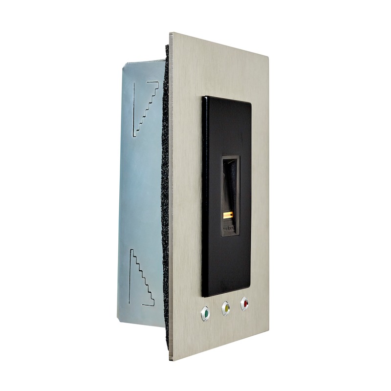 Der ekey home Fingerscanner integra Bluetooth mit dem schwarzem Dekorelement und dem Wandmontageset (mit Alarm-LEDs) aus Edelstahl ist ein biometrisches Sensorterminal zur Erfassung von Fingerprints mittels eines RF-Zeilensensors von Authentec. Bis zu 99 Finger sind speicherbar. Dieser Fingerscanner besitzt eine Bluetooth-Schnittstelle für die ekey home App. Die kostenlose ekey home App für iOS- und Android- Smartphones ermöglicht dem Nutzer, Gerät und Berechtigte vom Smartphone aus zu verwalten. Dieser ekey home Fingerscanner dient der Erkennung von berechtigten Personen und der daraus folgenden Öffnung von Haustüren, Wohnungstüren, Garagentoren usw. Der Fingerscanner ist für die Verwendung im Heim- und Gewerbebereich vorgesehen. Der ekey home Fingerscanner integra Bluetooth ist für die ortsfeste Montage an unbeweglichen Teilen wie Mauerwerk und für den Einsatz im ungeschützten Außenbereich vorgesehen. Für den Betrieb benötigen Sie zusätzlich eine passende Steuereinheit, ein passendes Dekorelement ein passendes Netzteil, die ekey home App und passendes Montagezubehör.