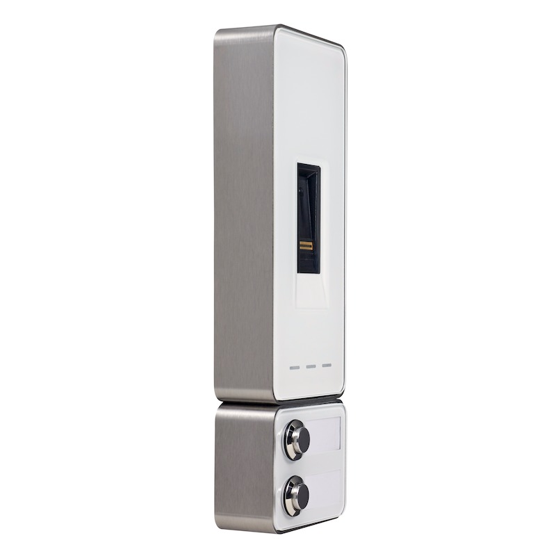 Der ekey home Fingerscanner integra Bluetooth RFID mit Montagerahmen aus Edelstahl mit Glasfront in weiß (inkl. Alarm-LEDs) und Klingelmodul ist ein biometrisches Sensorterminal zur Erfassung von Fingerprints mittels eines RF-Zeilensensors von Authentec. Zusätzlich ist die Idenjpgikation von RFID-Karten der Type MIFARE DESFire EV1 mit mindestens 1 kByte Speicher möglich. Bis zu 99 Finger und Karten sind speicherbar. Dieser Fingerscanner besitzt eine Bluetooth-Schnittstelle für die ekey home app. Die kostenlose ekey home App für iOS- und Android-Smartphones ermöglicht dem Nutzer, Gerät und Berechtigte vom Smartphone aus zu verwalten. Dieser ekey home Fingerscanner dient der Erkennung von berechtigten Personen und der daraus folgenden Öffnung von Haustüren, Wohnungstüren, Garagentoren usw. Der Fingerscanner ist für die Verwendung im Heim- und Gewerbebereich vorgesehen. Der ekey home Fingerscanner integra 2.0 Bluetooth RFID ist für die ortsfeste Montage an unbeweglichen Teilen wie Mauerwerk und für den Einsatz im ungeschützten Außenbereich vorgesehen. Für den Betrieb benötigen Sie zusätzlich eine passende Steuereinheit, ein passendes Dekorelement ein passendes Netzteil, die ekey home App und passendes Montagezubehör.