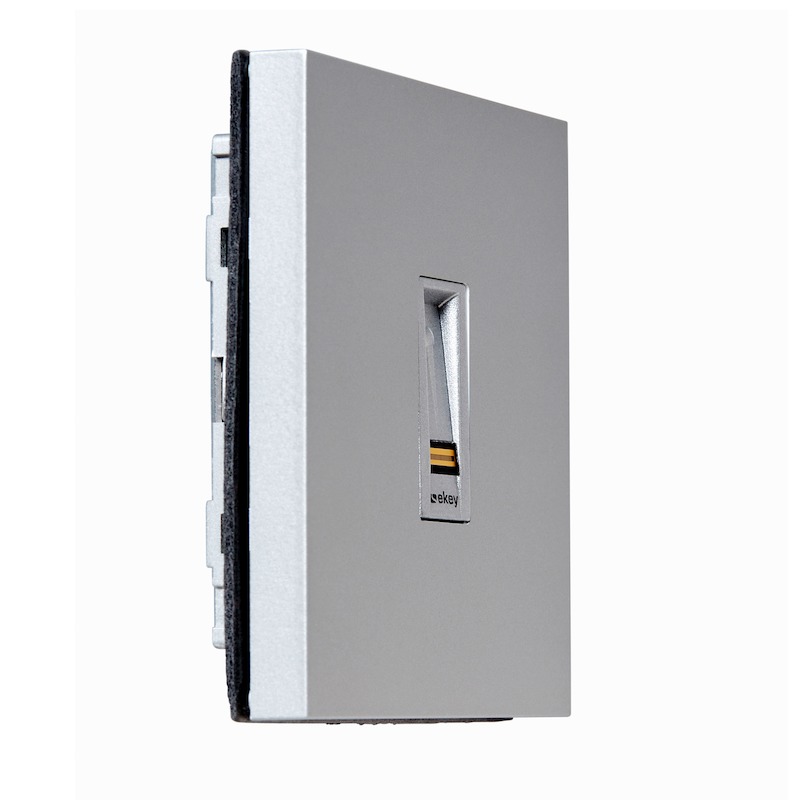 Der ekey home Fingerscanner RFID für die Integration in die Sprechanlage SIEDLE Vario ist ein biometrisches Sensorterminal zur Erfassung von Fingerprints mittels eines RF-Zeilensensors von Authentec. Zusätzlich ist die Idenjpgikation von RFID-Karten der Type MIFARE DESFire EV1 mit mindestens 1 kByte Speicher möglich. Bis zu 99 Finger und 99 Karten sind speicherbar. Dieser ekey home Fingerscanner dient der Erkennung von berechtigten Personen und der daraus folgenden Öffnung von Gebäudetüren, Firmentüren, Garagentoren usw. Der Fingerscanner ist für die Verwendung im Heim- und Gewerbebereich vorgesehen. Der ekey home Fingerscanner Unterputz RFID ist für die ortsfeste Montage an unbeweglichen Teilen wie Sprechanlagen im ungeschützten Außenbereich vorgesehen. Für den Betrieb benötigen Sie zusätzlich eine passende Steuereinheit und ein passendes Netzteil.