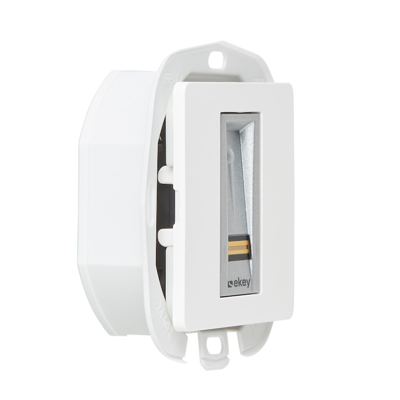 Der ekey home Fingerscanner Unterputz RFID inkl. Dekorblende Reinweiß ist ein biometrisches Sensorterminal zur Erfassung von Fingerprints mittels eines RF-Zeilensensors von Authentec. Zusätzlich ist die Idenjpgikation von RFID-Karten der Type MIFARE DESFire EV1 mit mindestens 1 kByte Speicher möglich. Bis zu 99 Finger und 99 Karten sind speicherbar. Dieser ekey home Fingerscanner dient der Erkennung von berechtigten Personen und der daraus folgenden Öffnung von Gebäudetüren, Firmentüren, Garagentoren usw. Der Fingerscanner ist für die Verwendung im Heim- und Gewerbebereich vorgesehen. Der ekey home Fingerscanner Unterputz RFID ist für die ortsfeste Unterputzmontage an unbeweglichen Teilen wie Mauerwerk im ungeschützten Außenbereich vorgesehen. Für den Betrieb benötigen Sie zusätzlich ein passendes Dekorelement, eine passende Steuereinheit und ein passendes Netzteil.