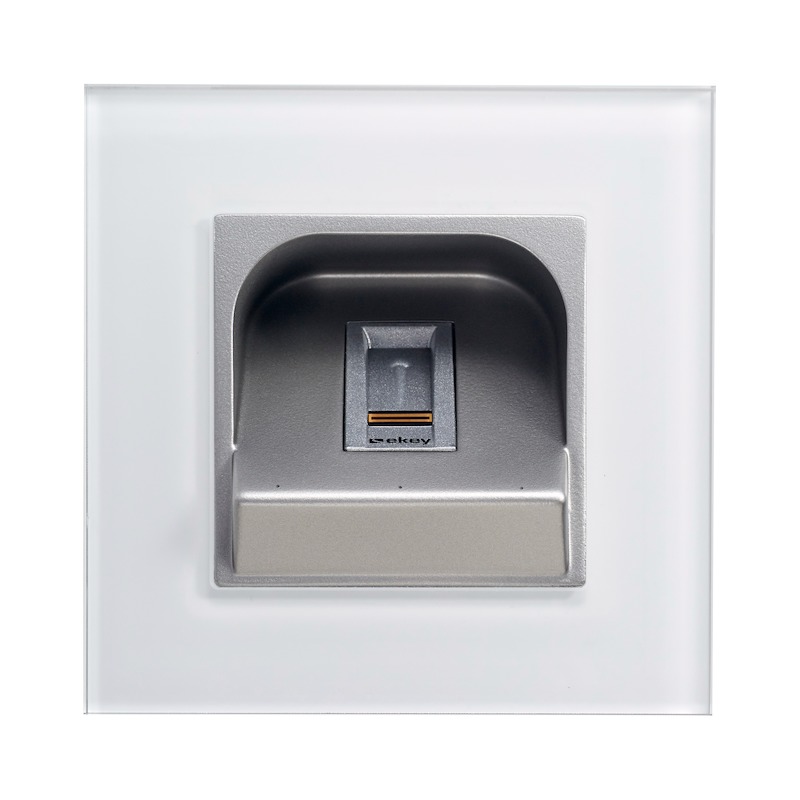 Der ekey home Fingerscanner Unterputz RFID mit Glasrahmen in weiß inkl. Alarm-LEDs ist ein biometrisches Sensorterminal zur Erfassung von Fingerprints mittels eines RF-Zeilensensors von Authentec. Zusätzlich ist die Idenjpgikation von RFID-Karten der Type MIFARE DESFire EV1 mit mindestens 1 kByte Speicher möglich. Bis zu 99 Finger und 99 Karten sind speicherbar. Dieser ekey home Fingerscanner dient der Erkennung von berechtigten Personen und der daraus folgenden Öffnung von Gebäudetüren, Firmentüren, Garagentoren usw. Der Fingerscanner ist für die Verwendung im Heim- und Gewerbebereich vorgesehen. Der ekey home Fingerscanner Unterputz RFID ist für die ortsfeste Unterputzmontage an unbeweglichen Teilen wie Mauerwerk im ungeschützten Außenbereich vorgesehen. Für den Betrieb benötigen Sie zusätzlich ein passendes Dekorelement, eine passende Steuereinheit und ein passendes Netzteil.