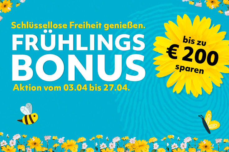 Entdecken Sie den ekey Frühlings-Bonus! Ab dem 3. April profitieren Sie in unserem Onlineshop von unschlagbaren Preisvorteilen auf modernste Zutrittslösungen. Sichern Sie sich € 100,- Nachlass auf alle ekey xLine und sLine Sets sowie satte € 200,- auf unsere ekey Komplettlösungen. Nutzen Sie die Gelegenheit bis zum 27. April und machen Sie Ihr Zuhause fit für die Zukunft.